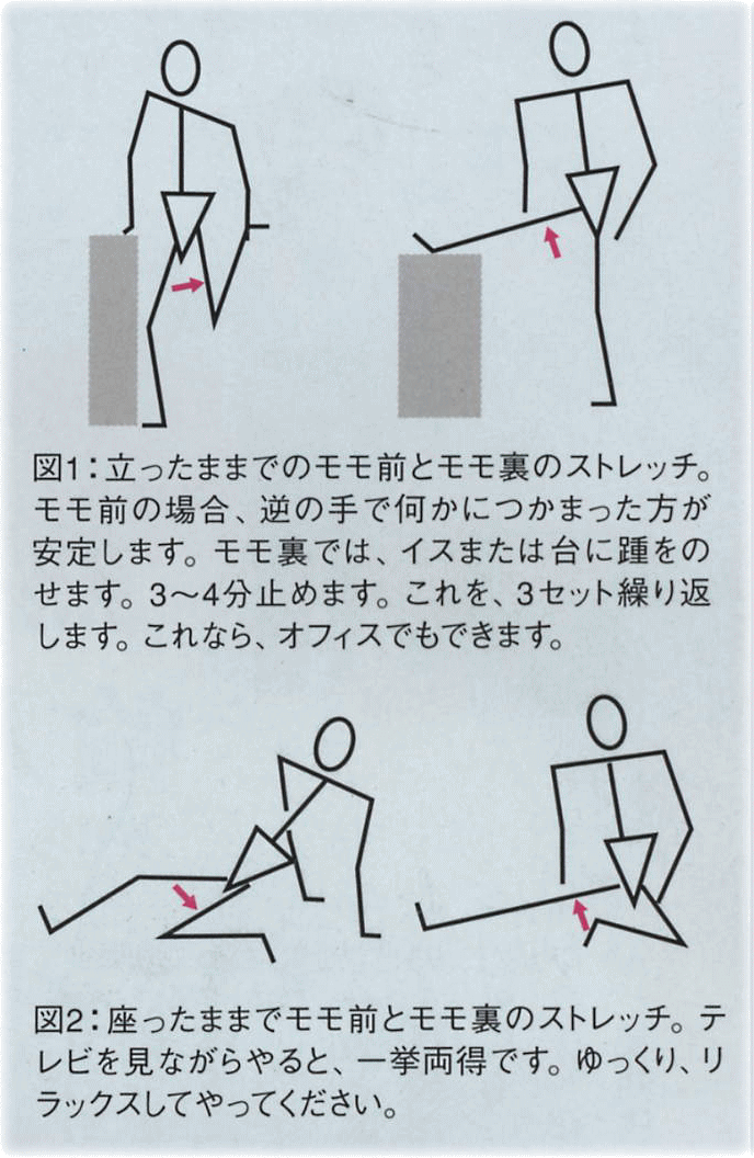ストレッチ「体がかたい人は良いスポーツ選手になれない。」と昔からの言い伝えがあります。それで、我々は子供の頃よく柔軟体操をやりました。体がかたいとどうして良い選手になれないのでしょうか?答えがあります。股関節周囲の柔軟性の低下がある選手は、腰や膝の痛みの出ることが多く、スポーツ選手として十分活躍できなくなることがあるからです。腰あるいは膝が痛いためスポーツが出来ず、ブルーになっている子供はいませんか。その子は最近、背が急に伸びていますか?足は太くなっていませんか?体はかたくないですか?体がかたい人では、モモ前やモモ裏の筋肉の骨に対する相対的な短縮により、骨盤や腰に負担をかけたり、膝蓋骨の周囲に負担をかけたりすることがあります。この病態が意外に多いのです。これらの筋の相対的短縮を放っておくと、さらに重大な問題が起こります。 成長期では身長(特に下肢)が伸びなくなることがあるのです。相対的短縮とは、大腿骨と比較して太モモの筋肉の長さが足りないという事ですので、急な身長(大腿骨)の伸びがあっても、太モモが太く強くなっても、同じように筋の相対的短縮が起こります。この場合、筋肉ストレッチで伸ばしてやることが必要です。 ![]() 図1のように、立ったままでもストレッチできます。学校や会社で行う場合はこの方法が良いでしょう。モモ前の筋ではこの様に足首を持って約3〜4分止めます。決して勢いをつけません。そして、右左3セットずつ行います。これだけで計約20分かかります。これに、モモ裏の筋およびアキレス腱のストレッチを追加すると計約60分にもなります。非常に面倒くさくて時間がかかるものです、ストレッチというのは。 座った状態でのストレッチも勧めます。(図2)。これは、体操着に着替えて練習や試合を見学しているとき、あるいは自宅でテレビを見ているときに有効です。1日中ストレッチをして下さい。 その他のストレッチの効用は、筋肉から乳酸を絞り出して疲れを取ってくれたり、神経を刺激してくれたりします。ストレッチは時間がかかって面倒くさいし非常にだるいのですが、必ず続けて下さい。痛みも問題ですが、成長期では、加えて身長も伸びてないのでは、現代スポーツには不向きな体になってしまいます。短足などはもっての他です。体のかたい人は良い選手になれないようです。 千葉 昌宏 |